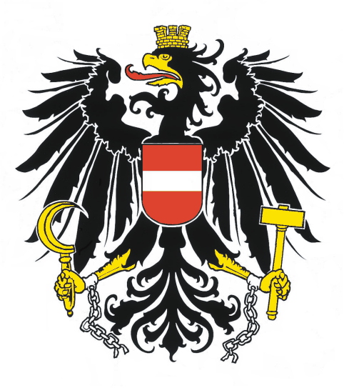 Der moderne Babenberger Adler mit der Goldkrone des Wikingerfürsten (überlappte Goldblechrechtecke), der goldenen Schwursichel der Druiden, dem Hammer des Thor, den sprechenden Ketten, den Klingenfedern, und mit dem rot-weiß-roten Zentralschild. Der züngelnde Adler ist ein Babenberger Greif in Schwarz mit dem in der göttlichen Dreizahl auslaufenden Federschwanz, der "Plume" (vgl. von Plumenowe) | |